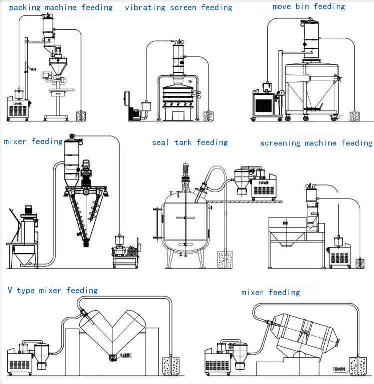給料管開始吸料時按下給料開關,當吸料過程完成時,振動裝置振動或反沖洗裝置反吹,防止堵塞過濾器。