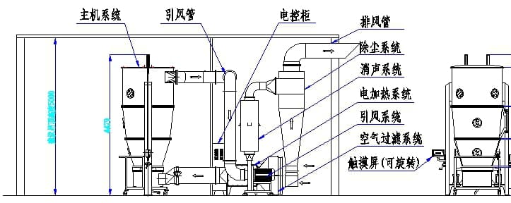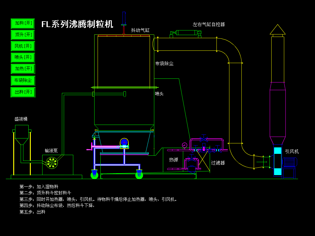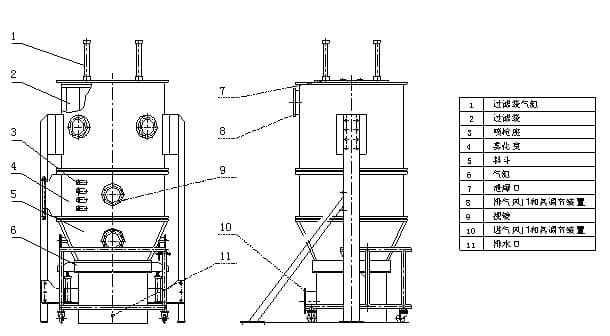 設備由流化床(原料容器)和噴霧干燥室、捕集室、頂升系統以及基座、霧化系統、加熱系統、空氣過濾系統和引風系統組成。當設備啟動后主機各容器自動密封,在引風機的抽吸下,設備內部形成一定量的負壓(可調),物料受負壓的作用,自流化床內向上運動至噴霧干燥室,由于噴霧干燥室的空間較流化床大,負壓下所產生的氣流在此部分流速變緩,從而物料自身重力克服了負壓氣流的推力后自然下落,當下落至一定高度后負壓產生的氣流推力大于物料自重時物料又向干燥室方向運動,以此往復形成流化狀態。通過對負壓氣流的調節,使物料形成良好的流化態,從而達到*佳的制粒干燥效果。