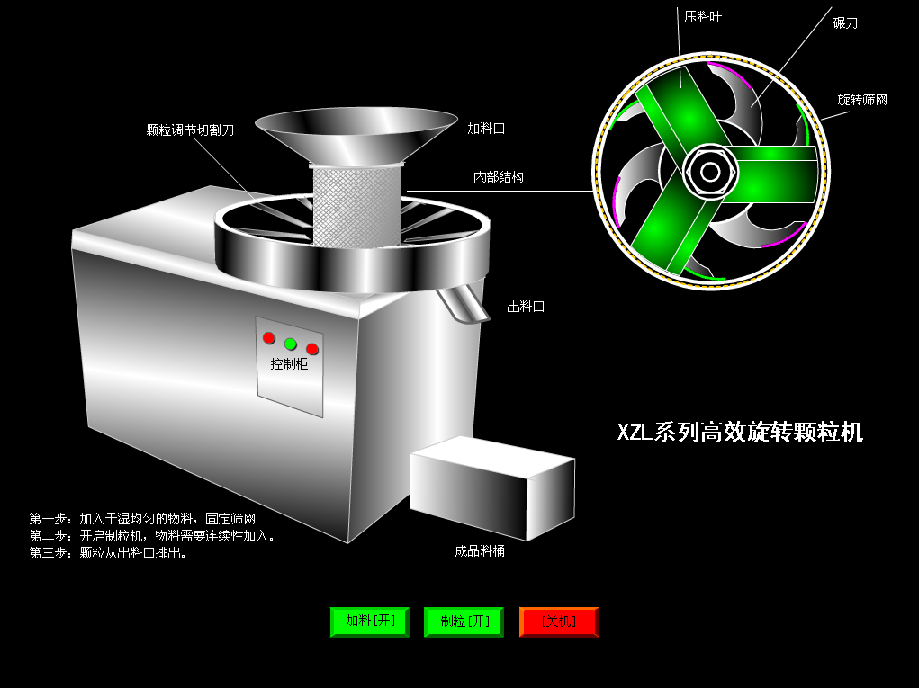顆粒機凡與物料接觸部分均采用不銹鋼制造,外型美觀,結構合理,制粒成型率高,顆粒美觀,自動出料,避免人工出料造成的顆粒破損,并適合流水作業。利用一組倒順旋轉碾刀的作用,通過不銹鋼篩孔擠壓成顆粒。特別是食品工業中用于雞精生產線生產雞精.味精及固體飲料。并可根據用戶需要選擇不同孔徑的篩筒,與物料接觸部位均采用不銹鋼材料制成,能確保物料的本色而不變質。