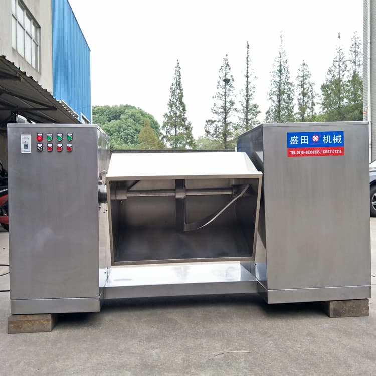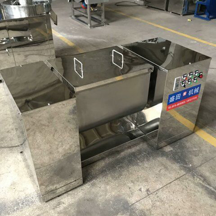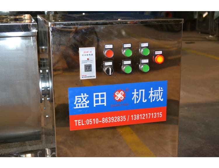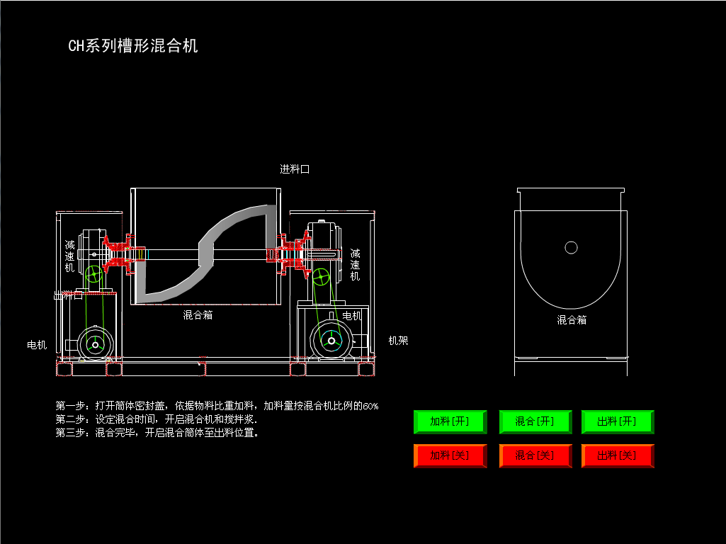本機通過機械傳動,使S式攪拌槳旋轉,推動物料往復翻動,均勻混合,操作時采用電氣控制,可設定混合時間,到時自動停機,從而提高每批物料的混合質量。按鈕控制,翻轉倒料。