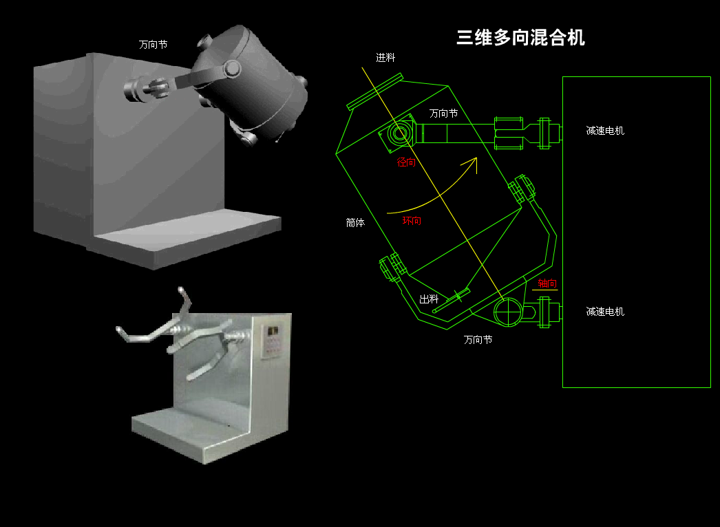 該機有機座,變頻制動電機主軸,回轉連桿及筒體等部分組分。裝料的筒體在主動軸的帶動下作平移及搖滾等復合運動,促使物料沿著筒體作環向、徑向和軸向的三向復合運動,從而實現多種物料的相互流動擴散、摻雜,以達到高均勻混合的目的。